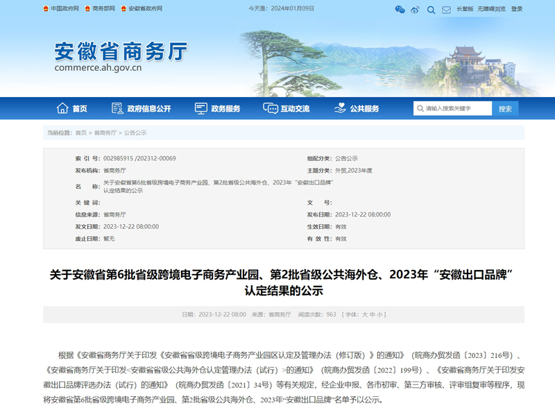 近日,安徽省商务厅公布2023年“安徽出口品牌”认定名单, 此次评选全省共44家企业,54个品牌获得认定,意昂体育科技“