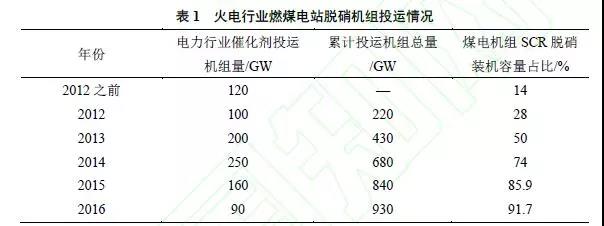 我国环保行业起步较晚,SCR催化剂的应用滞后于西方国家。1999年,大陆首次引入SCR脱硝催化剂用于火电行业的烟气治理,随后10 年不断推广及普及。截至2012年,国内已投运烟气脱硝机组容量为120GW,并且近5年有不断上升的趋势,2016年火电脱硝机组占比高达91.7%(详见表1)。“十一五”期间,我国NOx排放总量呈逐年上升趋势,2011年高达2405万t(工业源占71.9%);而《火电厂大气污染物排放标准》(GB 13223—2011)的严格执行及SCR脱硝机组满负荷投运,NOx排放总量逐年降低,2017年的排放量已降至1700万t左右。